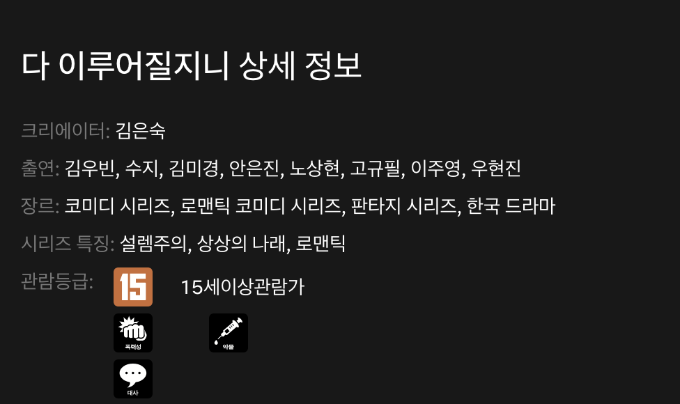 결국 다이루어질지니 기본정보는 단순한 로맨틱 코미디가 아니라 인간의 본질과 감정, 그리고 구원에 대한 이야기입니다. 김우빈의 유머러스하면서도 진지한 연기, 수지의 절제된 감정 표현, 그리고 김은숙 작가의 세련된 대사와 메시지가 어우러져 넷플릭스 최고 화제작으로 자리 잡았습니다. 다이루어질지니는 당신의 주말을 책임질 완성도 높은 판타지 로맨틱 코미디로 평가받고 있습니다.
