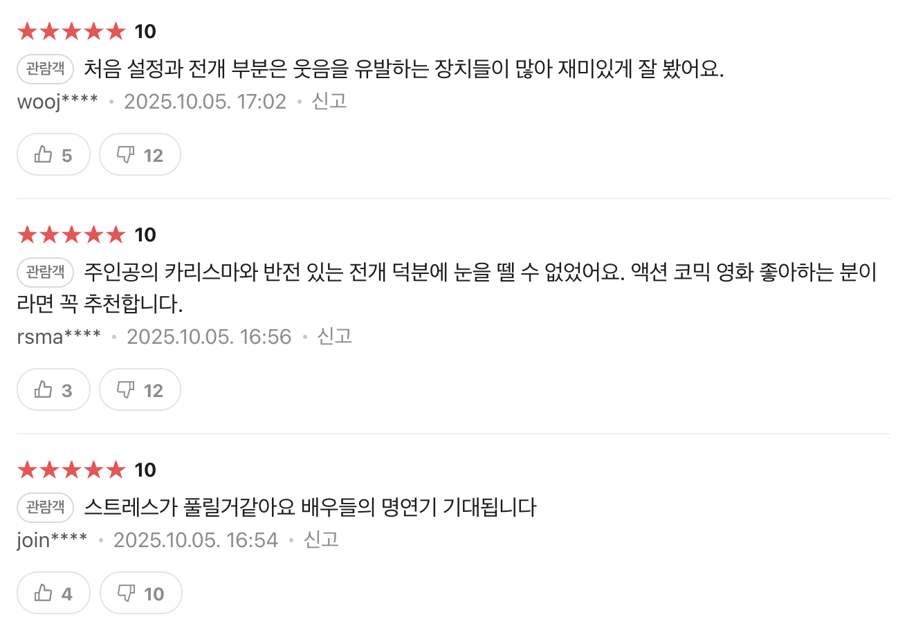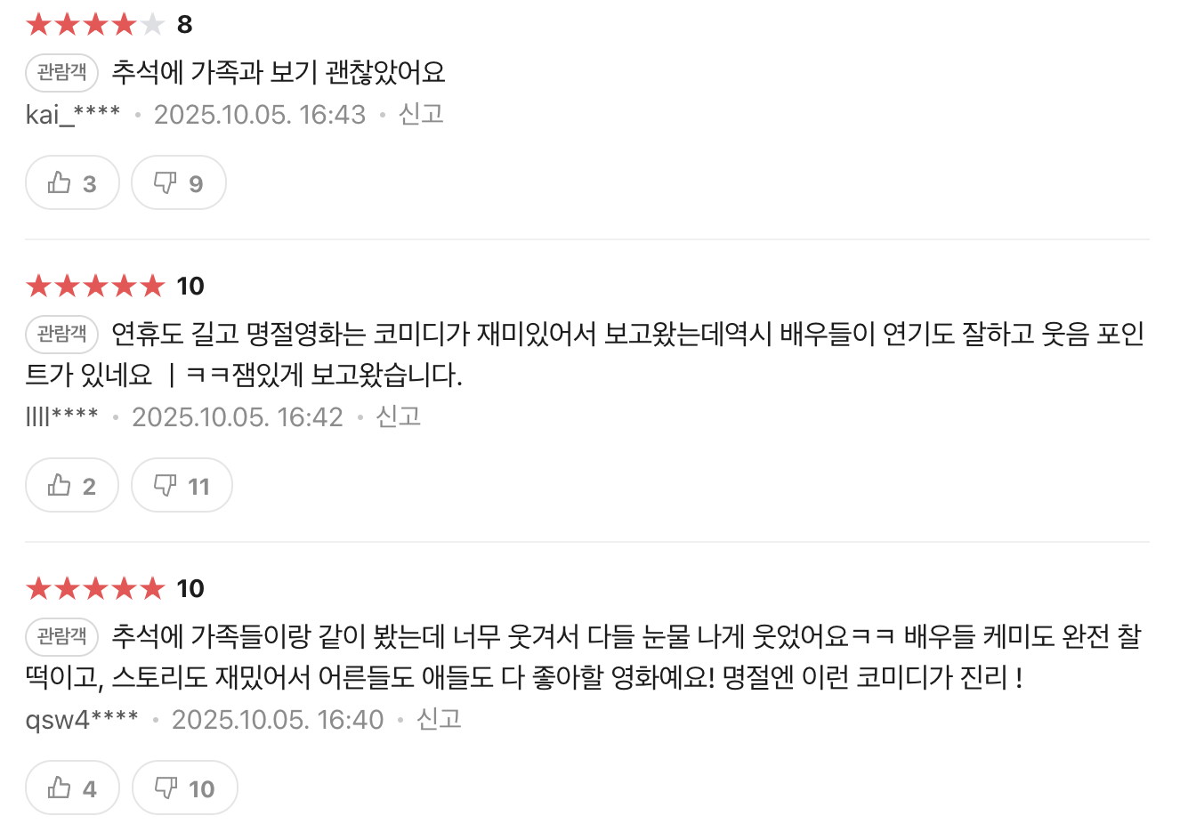 “연휴에 가족이랑 봤는데 너무 웃겨서 눈물 났어요. 배우들 케미도 완전 찰떡!”