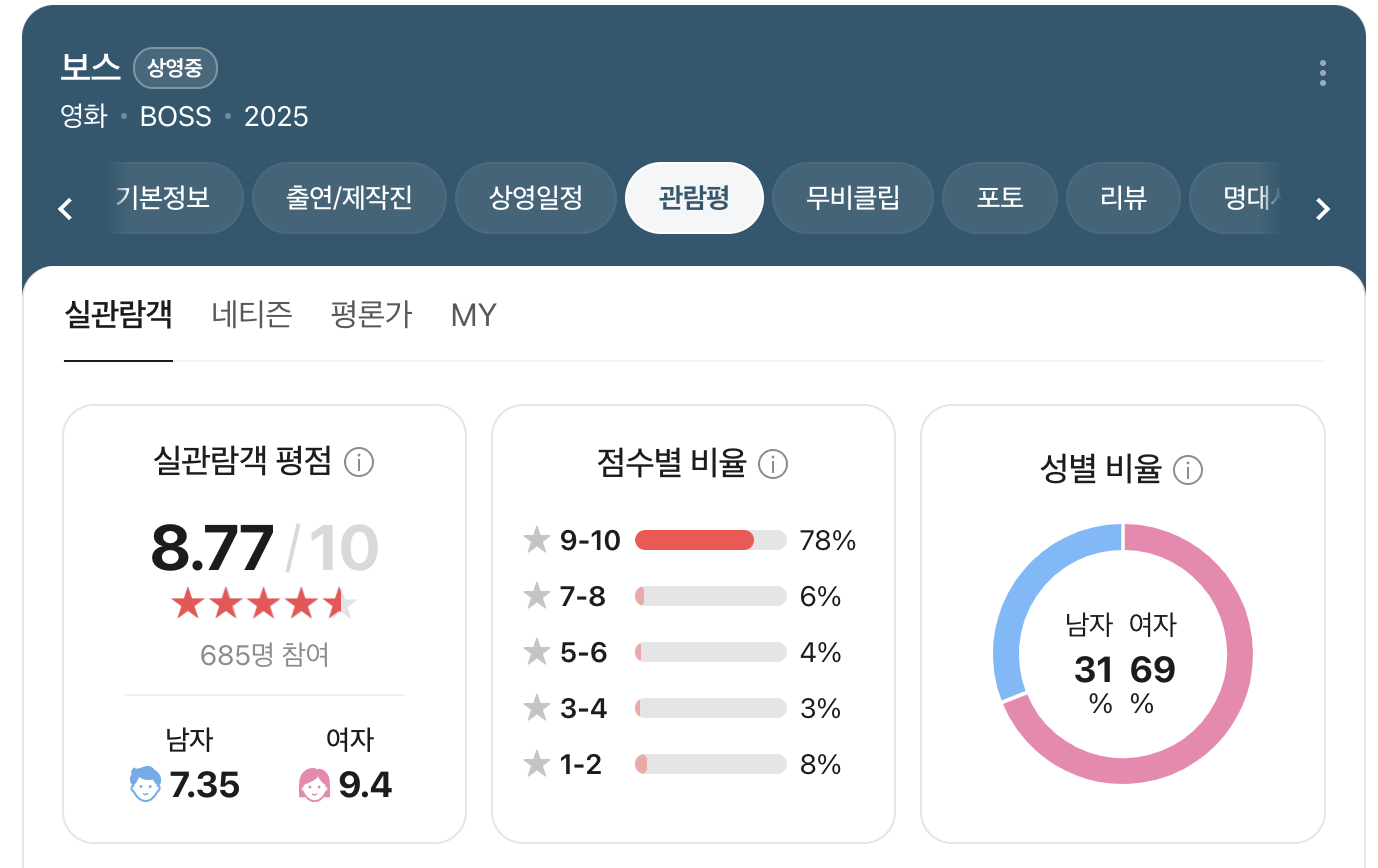 - “보스 재밌었어요. 웃음 포인트 많고 연출도 괜찮았음.”
