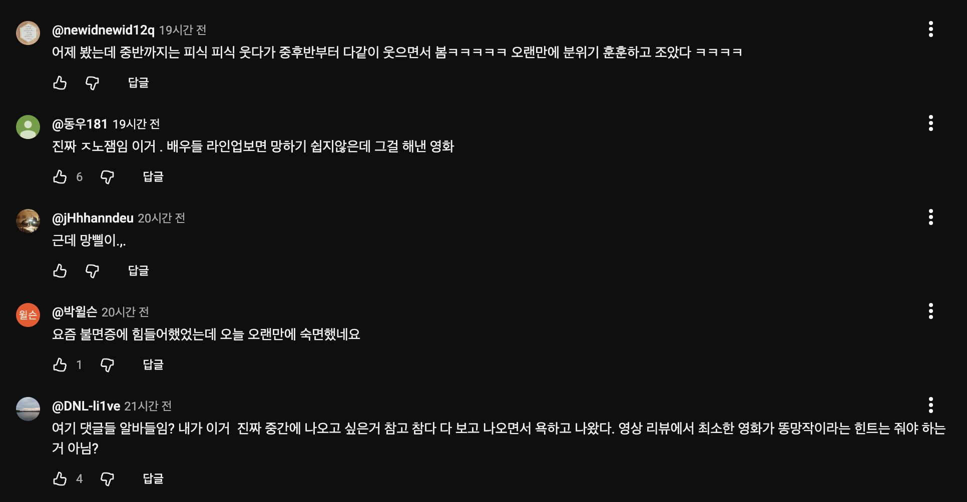 하지만 “가볍게 웃고 싶을 때 보기 좋은 영화”라는 점에서는 대부분 공감했습니다.