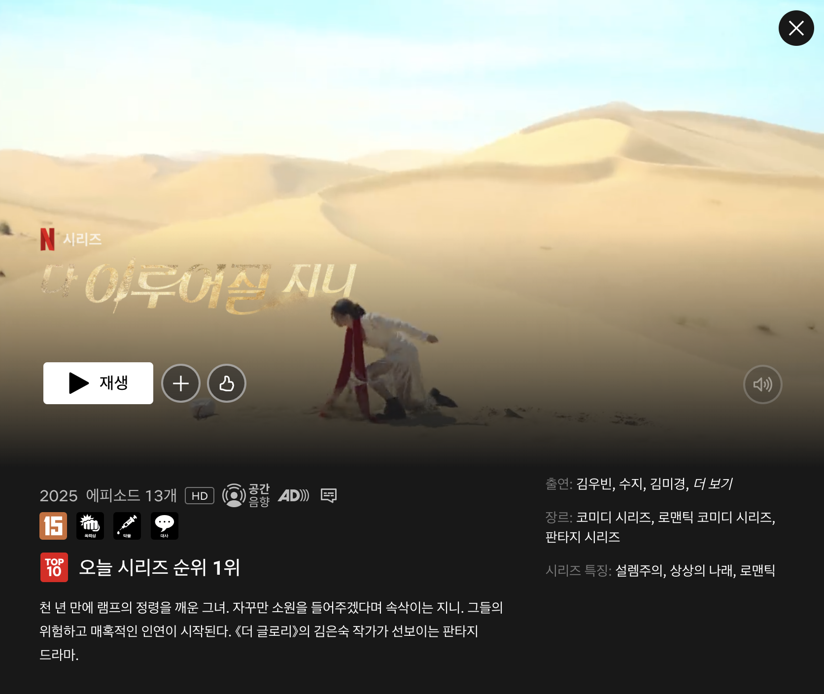 넷플릭스 오리지널 시리즈 다이루어질지니 기본정보는 공개 직후부터 폭발적인 반응을 얻고 있습니다. 천 년 만에 깨어난 사탄 지니와 감정이 없는 인간 가영의 목숨 건 내기를 그린 이 작품은 김은숙 작가 특유의 대사 감각과 배우 김우빈·수지의 재회로 기대를 높였습니다. 오늘은 다이루어질지니 기본정보를 중심으로 등장인물, 줄거리, 제작진, 시청 포인트까지 자세히 정리해 드립니다.